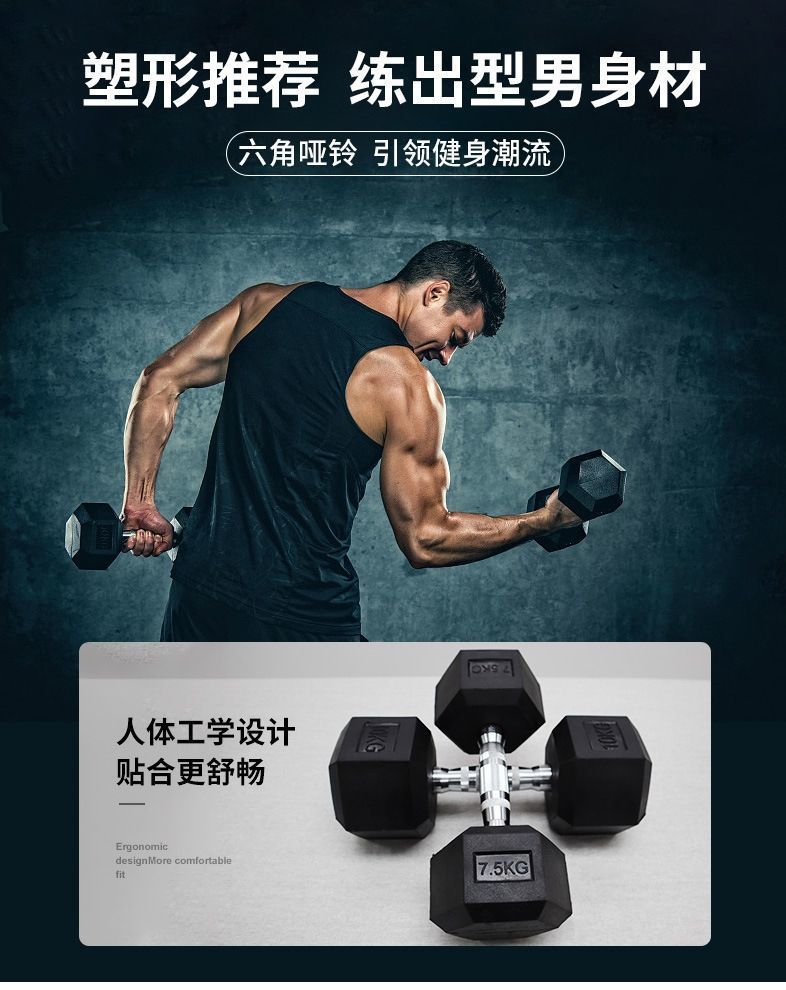 六角包胶哑铃男士健身家用实心铸铁2.5/5/7.5/10公斤